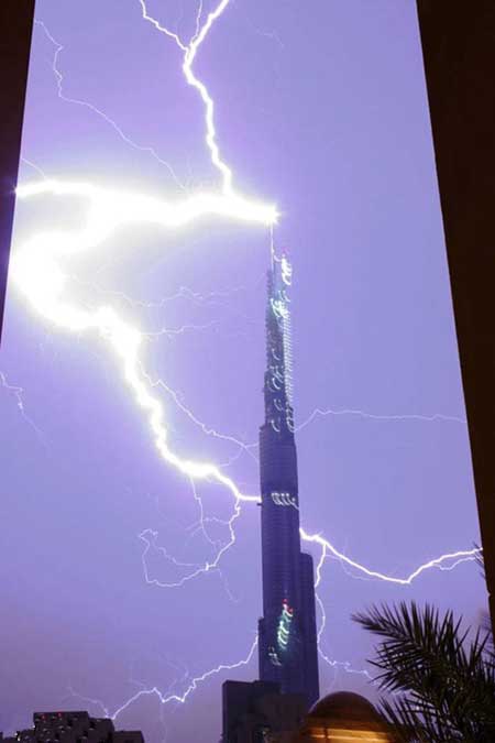 لم يكد بريق برج خليفة يهدأ قليلاً حتى عاد مجدداً بمجموعة من الصور المدهشة للمصور البارع أليسداير ميلر، ولكنها لم تكن هذه المرة لبرج خليفة نفسه، بل للبرق وهو يضرب مانع الصواعق في قمة برج خليفة:
