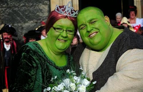 قرر ثنائي بريطاني أن يحتفلا بزواجهما بطريقة غير تقليدية، فكان فيلم الرسوم المتحركة “شريك” هو الخيار الأمثل، إذ ظهر العروسان في اليوم السعيد باللون الأخضر وطلبا من جميع الحضور التنكر بأزياء شخصيات الفيلم.