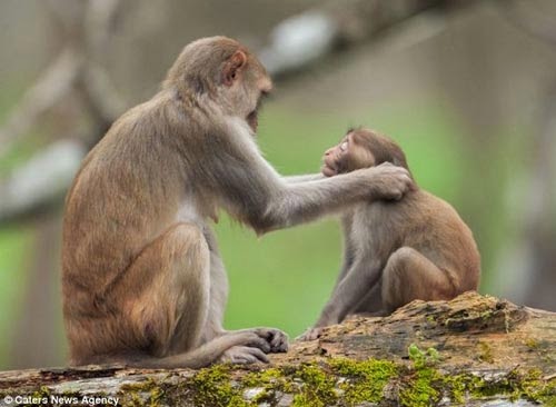 وأظهرت الصور التي نشرتها الصحيفة البريطانية كيف أن قردين شابين من نوع "المكاك" الآسيوي يلعبان مع بعضهما البعض، ولكن "مداعبة أحدهما الثقيلة" بقرص أذن رفيقه أصابت الثاني بالانزعاج.